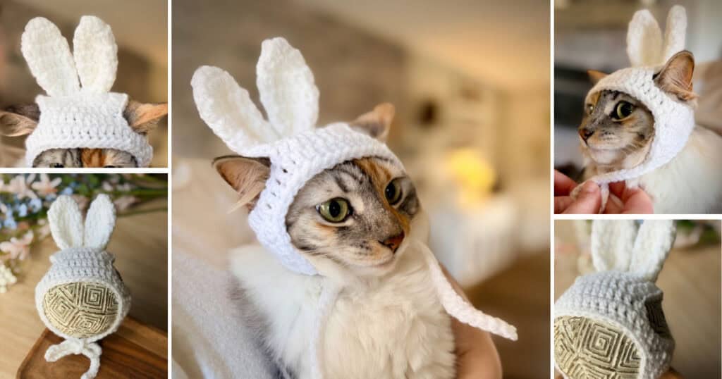 These little bunny hats for cats work up in NO TIME flat. With just a handful of rounds and a couple of cute little bunny ears, we’ve got an adorable “bunny” ready for photos for Easter. Will your cat wear one?
