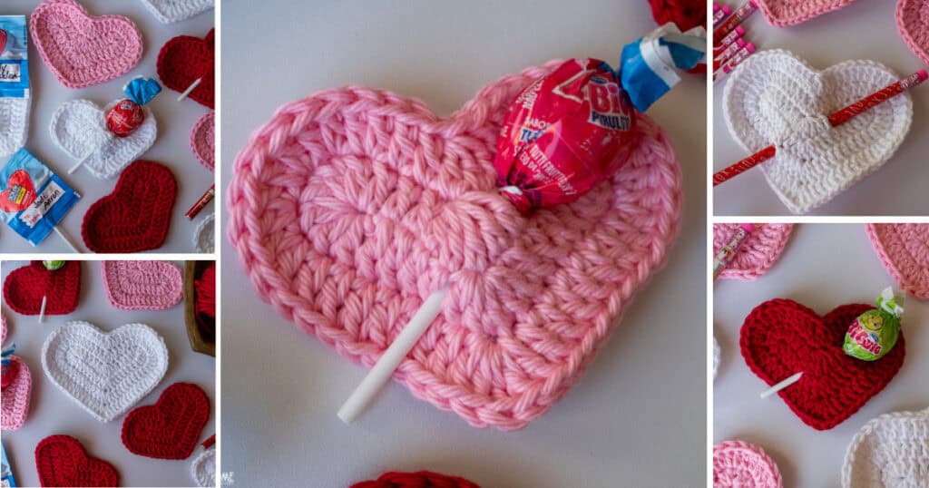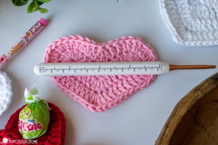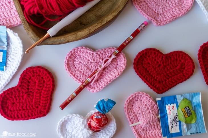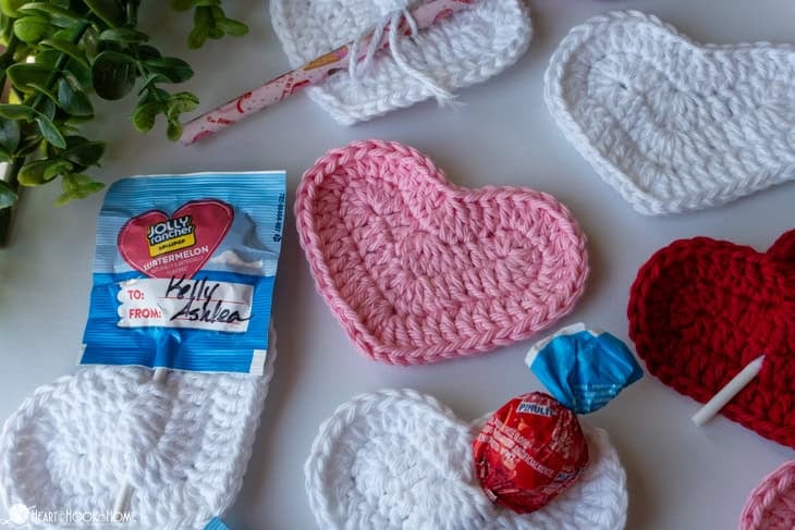 These little hearts are only 76 stitches total – just two rounds! They take less than 10 minutes to crochet a piece, and you can shove a sucker through the stitches and call it a Valentine. ♥