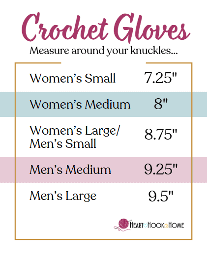 This crochet gloves with fingers pattern spans FIVE sizes from women’s small to men’s x-large. As you’re making the gloves, if you try them on, they should be tight. This is good! The stitches will relax a bit over time and we want the gloves to be nice and fitted even with wear.