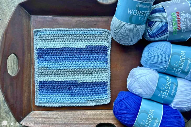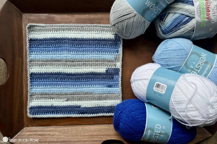 Do you love crocheting blankets and afghans for different holidays, but in bite-sized pieces? Then a Holiday Stitch Sampler blanket is for you! Grab your hook and yarn and let’s work up a Holiday Sparkle Stitch Mix blanket using this gorgeous sparkly yarn!