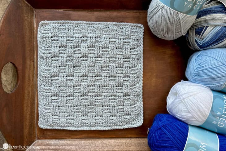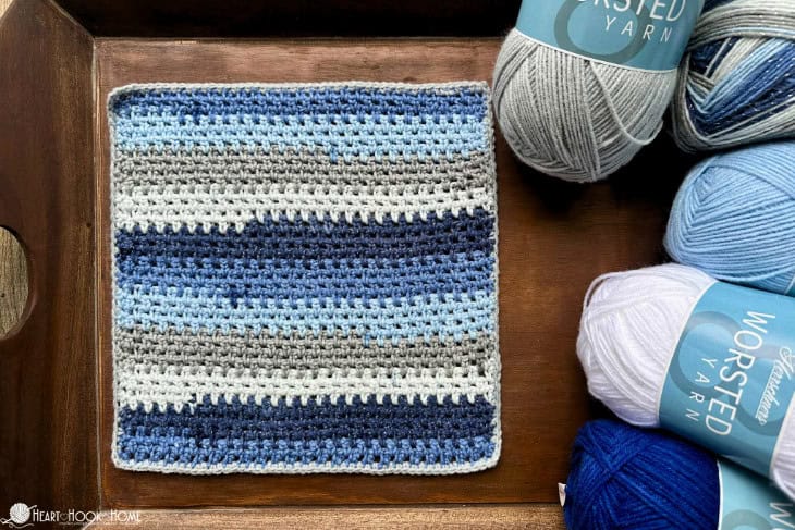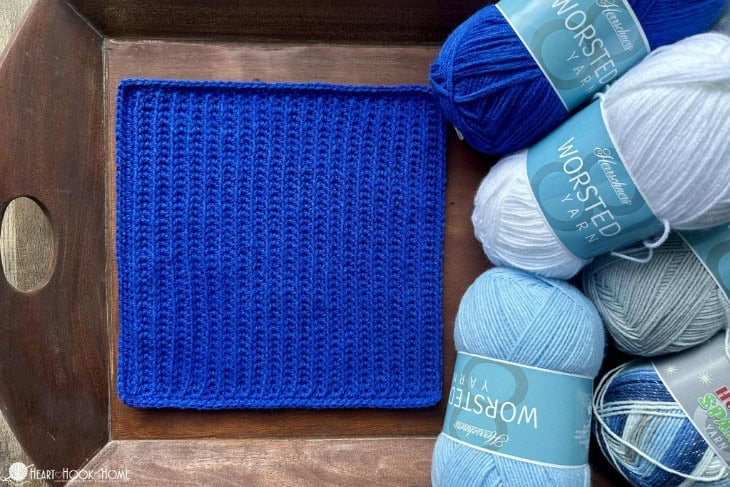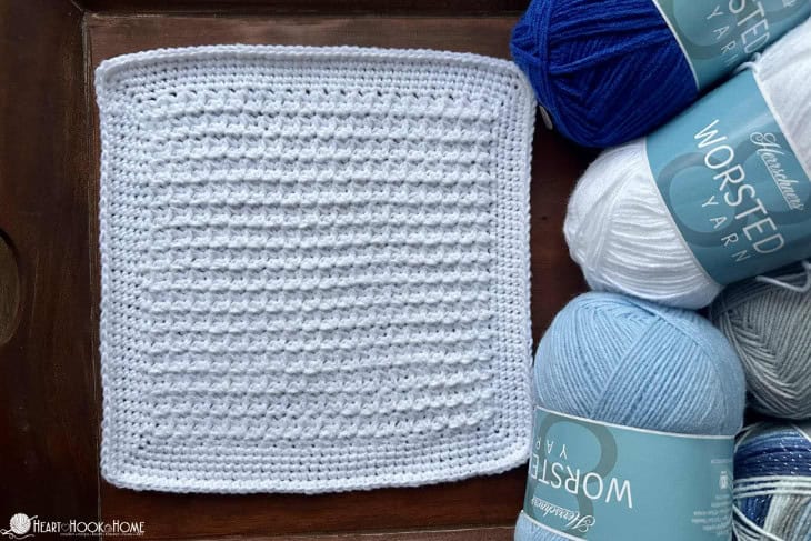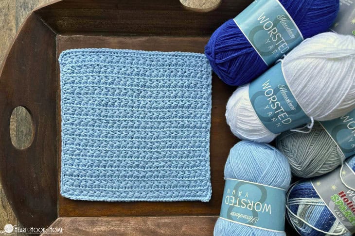 This one is a NEW stitch to Heart Hook Home! Head on over and watch the full tutorial if needed. This one is similar to the Moss Stitch and fun to make. For this square I used about 124 yards.