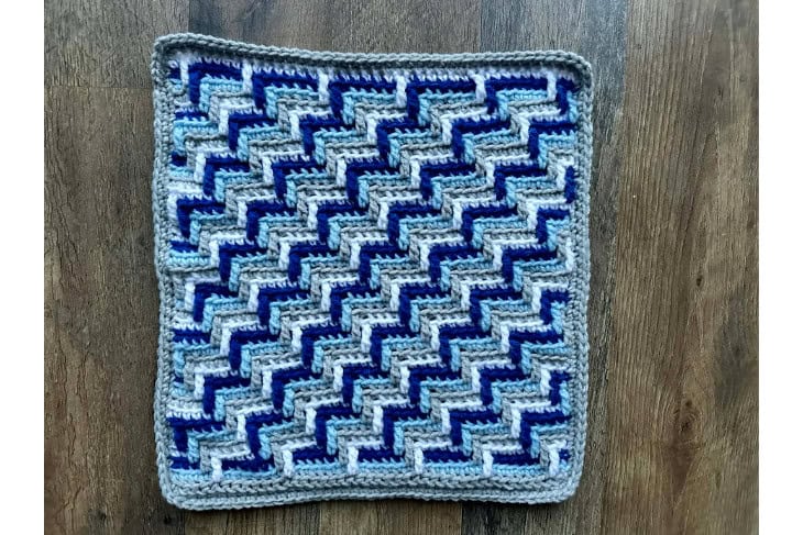 There is not yet a full tutorial for this stitch, but it is alternating Linked Treble Crochet and Single Crochet stitches. If you are new to this stitch, you could follow along with the Linked Double Crochet tutorial and do more rows as needed to get the square to size. For this square I used about 152 yards.