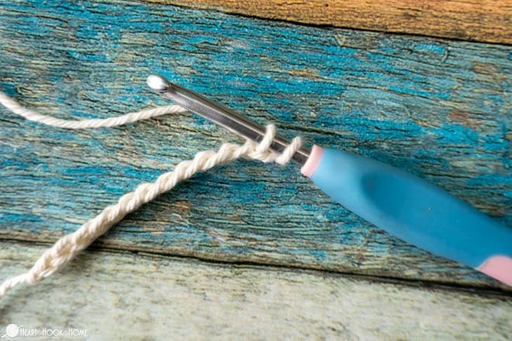 Yarn over pull through two loops, yarn over pull through two loops, yarn over pull through two loops, yarn over pull through two loops.