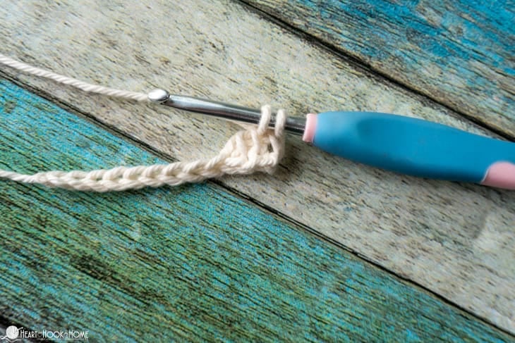 Now turn and pull up a loop in the first stitch of the row. (4 loops on hook). (Note that I find it helpful to pull up those first two loops before turning, but it doesn’t really matter)
